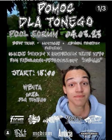 Zapraszamy na imprezę charytatywną dla naszego ziomala Tonego! Wbijajcie do @forum_skate_pool 04.03.23 o godzinie 18:00! Wbita to 10zł, które leci dla Tonego!Odbędą sie premierki: