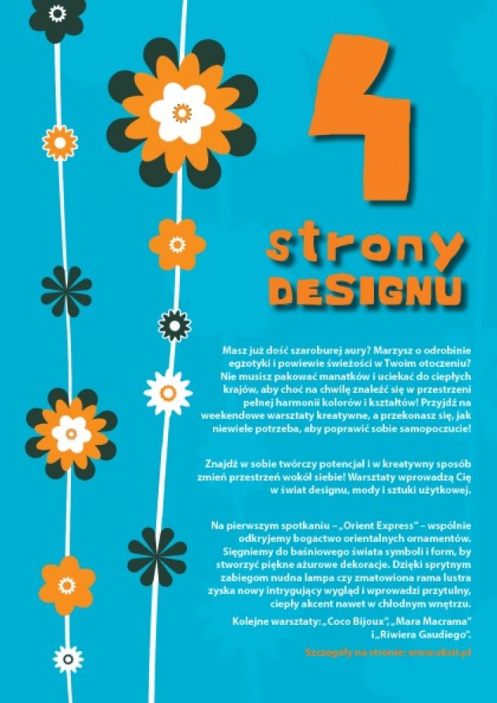 Znajd w sobie twórczy potencjał i w kreatywny sposób zmień przestrzeń wokół siebie! Warsztaty wprowadzš Cię w wiat designu, mody i sztuki użytkowej. Na pierwszym spotkaniu Orient Express wspólnie odkryjemy bogactwo orientalnych ornamentów. Sięgniemy do baniowego wiata symboli i form, by stworzyć piękne ażurowe dekoracje. Dzięki sprytnym zabiegom nudna lampa czy zmatowiona rama lustra zyska nowy intrygujšcy wyglšd i wprowadzi przytulny, ciepły akcent nawet w chłodnym wnętrzu. Kolejne warsztaty: Coco Bijoux, Mara Macrama i Riwiera Gaudiego.