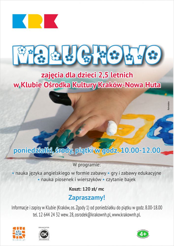 Klub Oœrodka Kultury Kraków-Nowa Huta zaprasza do Maluchowa na zajęcia dla dzieci 2,5 letnich.