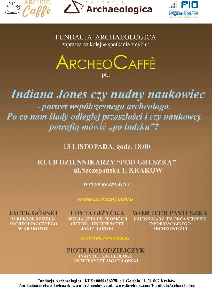 Cykl spotkań ArcheoCaffe jest jednym z etapów realizowanego przez Fundację Archaeologica projekt pt. „Silna organizacja narzędziem w ochronie dziedzictwa archeologicznego”, współfinansowanego z dotacji Funduszu Inicjatyw Obywatelskich Ministerstwa Pracy i Polityki Społecznej.