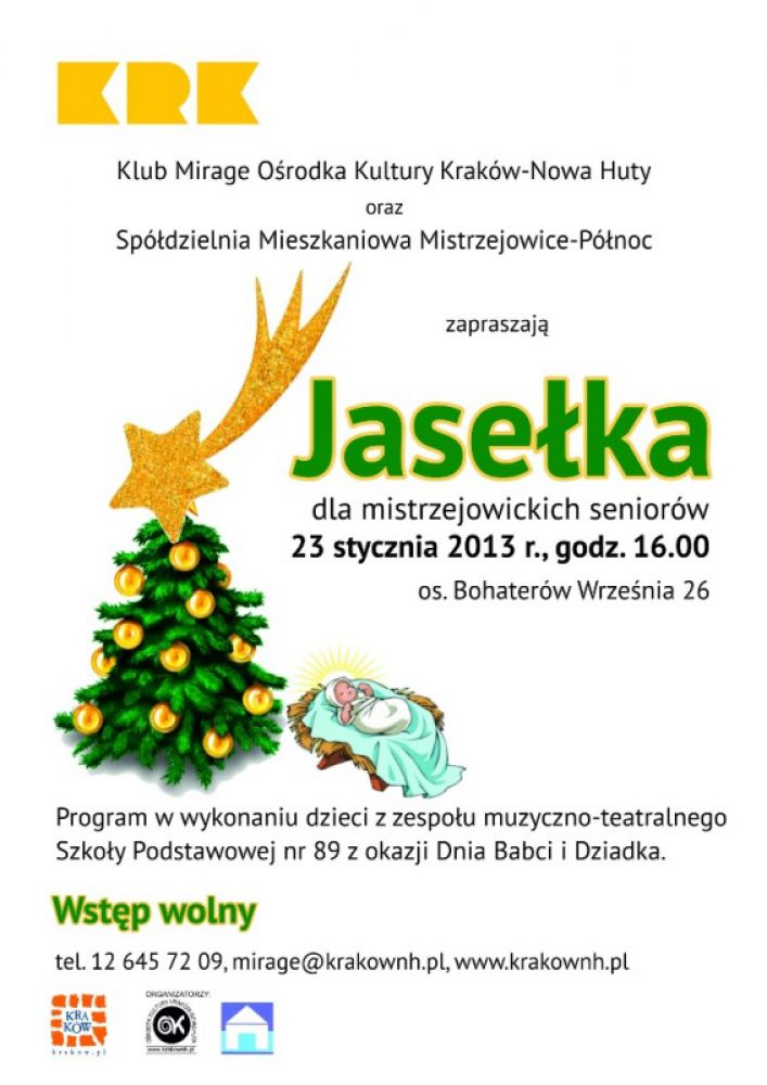 Klub Mirage Orodka Kultury Kraków-Nowa Huta (os. Bohaterów Wrzenia 26) zaprasza 23 stycznia o godz. 16.00 na Jasełka w wykonaniu dzieci z zespołu muzyczno-teatralnego Szkoły Podstawowej nr 89, a następnie wspólna biesiada.