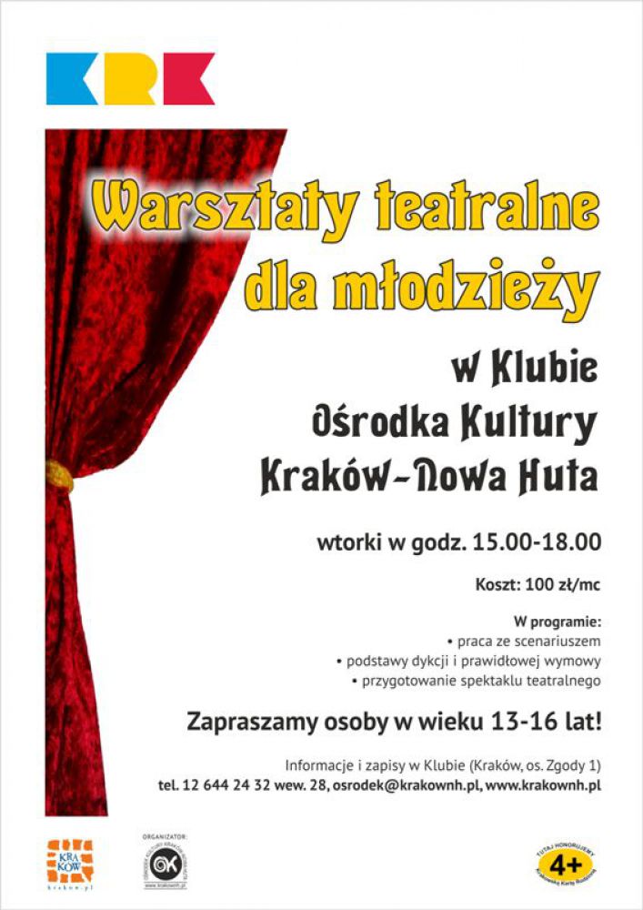 Klub Orodka Kultury Kraków-Nowa Huta (os. Zgody 1) ogłasza zapisy na Warsztaty teatralne. Zajecia przeznaczone sš dla osób w wieku 13-16 lat.