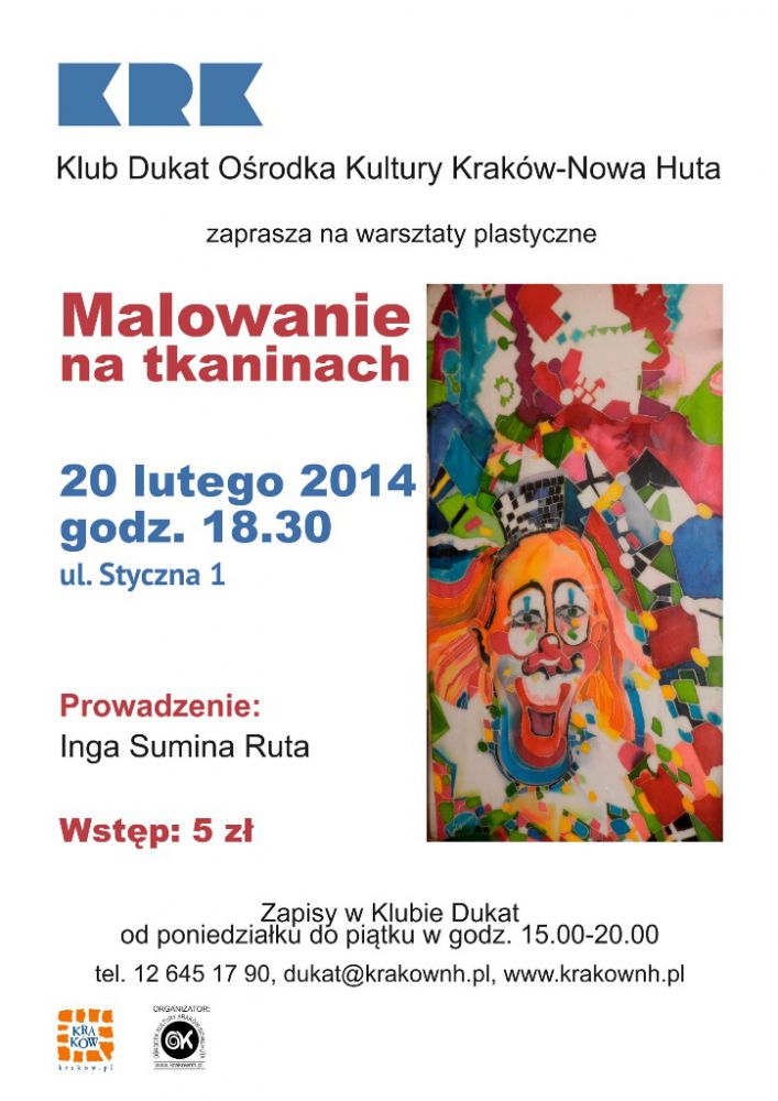 Zapraszamy mieszkańców Grębałowa na warsztaty plastyczne powięcone technikom malowania na tkaninach, które organizuje Klub Dukat Orodka Kultury Kraków-Nowa Huta (ul. Styczna 1).