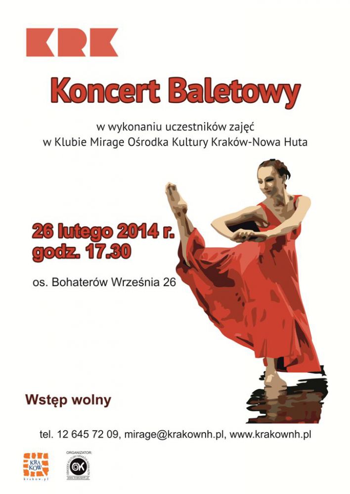 Klub Mirage Oœrodka Kultury Kraków-Nowa Huta (os. Bohaterów Wrzeœnia 26) zaprasza miłoœników tańca klasycznego na koncert w wykonaniu uczestników zajęć baletowych, który odbędzie się 26 lutego o godz. 17.30.