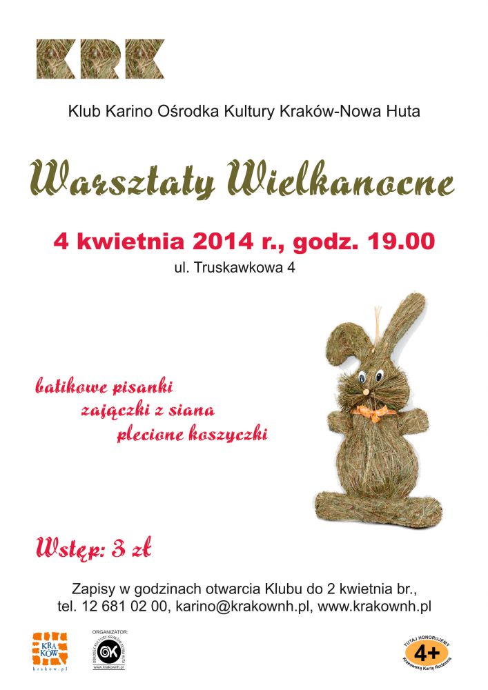 Klub Karino Oœrodka Kultury Kraków-Nowa Huta (ul. Truskawkowa 4) zaprasza dorosłych na œwišteczne warsztaty rękodzieła, które odbędš się 4 kwietnia o godz. 19.00. Podczas zajęć będzie można poznać techniki wykonania batikowych pisanek, zajšczków z siana oraz plecionych koszyczków.