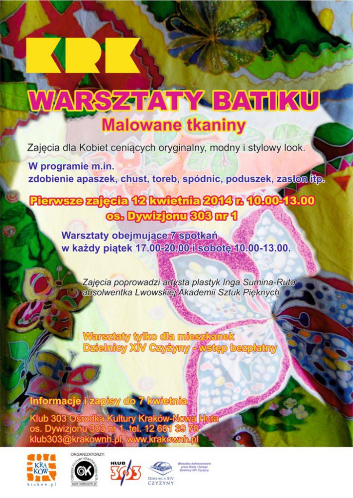 Klub 303 Orodka Kultury Kraków-Nowa Huta (os. Dywizjonu 303 nr 1) zaprasza na zajęcia malowania na tkaninach adresowane wyłšcznie do mieszkanek Dzielnicy Czyżyny. Uczestnicy warsztatów poznajš bardzo nietypowš sztukę zdobienia i malowania tkanin przy wykorzystaniu wosku pszczelego z dodatkiem stearyny. Zdobione będš elementy garderoby m.in. apaszki, chusty, torby, spódnice. Zajęcia, prowadzone przez Ingę Sumina-Ruta - absolwentkę Lwowskiej Akademii Sztuk Pięknych, zostały przygotowane z mylš o Kobietach cenišcych oryginalny, modny i stylowy look.