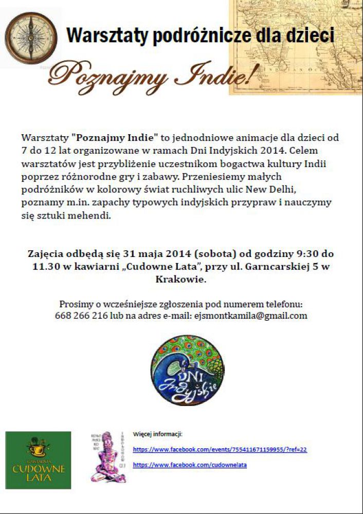 Serdecznie zapraszamy na warsztaty "Poznajmy Indie" - jednodniowe animacje dla dzieci od 7 do 12 lat organizowane w ramach Dni Indyjskich 2014. Celem warsztatów jest przybliżenie uczestnikom bogactwa kultury Indii poprzez różnorodne gry i zabawy. Przeniesiemy małych podróżników w kolorowy wiat ruchliwych ulic New Delhi, poznamy m.in. zapachy typowych indyjskich przypraw i nauczymy się sztuki mehendi.