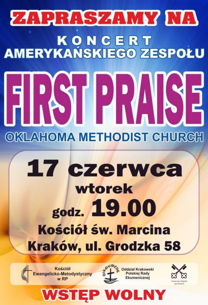 Serdecznie zapraszamy na koncert amerykańskiego zespołu "First Praise" z Oklahoma Methodist Church (Metodystycznego Koœcioła Oklahomy)!