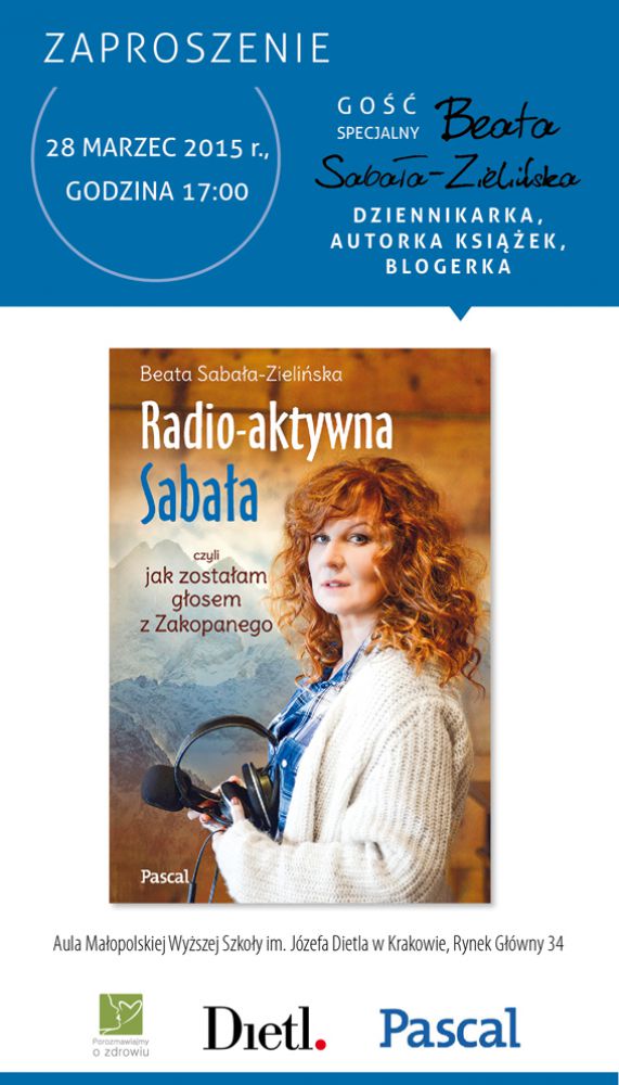Po bloku wykładów na temat zdrowia piersi odbędzie się spotkanie promocyjne najnowszej ksišżki Beaty Sabały-Zielińskiej „Radio-aktywna Sabała, czyli jak zostałam głosem z Zakopanego”. Autorka opowie o kulisach powstawania ksišżki oraz o tym, za co kocha góry.