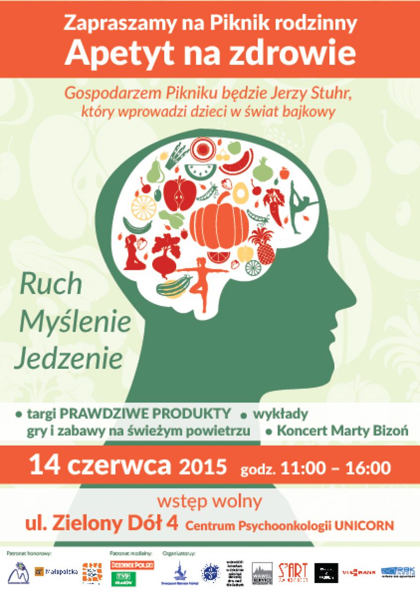14 czerwca (niedziela) to dzień, w którym każdy mieszkaniec Krakowa będzie mógł najeć się zdrowiem do syta. W Centrum Psychoonkologii UNICORN w Krakowie (ul. Zielony Dół 4) odbędzie się Rodzinny Piknik APETYT NA ZDROWIE. Celem spotkania jest szeroko rozumiana profilaktyka zdrowia i promocja zdrowego stylu życia. Wydarzenie kierowane jest do wszystkich mieszkańców Krakowa, a w szczególnoci rodzin z dziećmi oraz osób starszych.