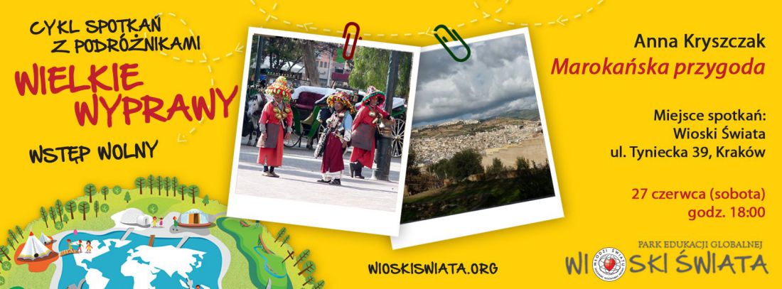 27 czerwca (w sobotę) o godzinie 18:00 czeka nas Marokańska przygoda. Zapraszamy Państwa serdecznie na ulicę Tynieckš 39 do Wiosek Œwiata na spotkanie z cyklu Wielkie Wyprawy.