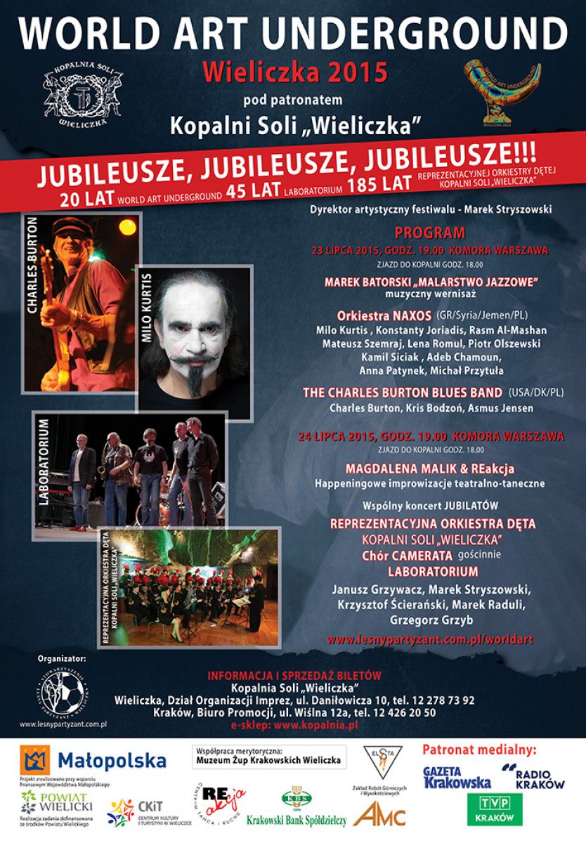 Tegoroczna, siódma już edycja festiwalu od poczštku nierozłšcznie zwišzana z Kopalniš Soli w Wieliczce, gdzie odbywa się festiwal – stšd nazwa festiwalu World Art Underground – Wieliczka 2015 pod patronatem Kopalni Soli „Wieliczka” odbędzie pod hasłem „Jubileusze, jubileusze, jubileusze!!!” i jest kontynuacjš przyjętego programu ramowego poprzednich festiwali. ze szczególnym zwróceniem uwagi na jego interdyscyplinarny charakter, co jest jego szczególnš wizytówkš. Pomysłodawcš, organizatorem i dyrektorem artystycznym wszystkich edycji festiwalu jest Marek Stryszowski, muzyk, kompozytor i aranżer.