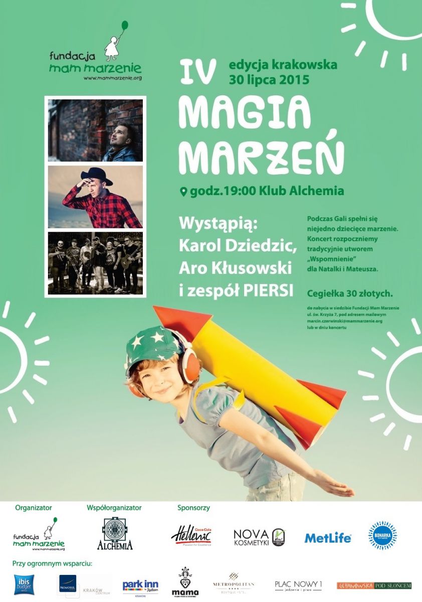 Już po raz czwarty - Ambasador Fundacji Mam Marzenie Małgorzata Kożuchowska oraz wolontariusze serdecznie zapraszajš wszystkich na koncert charytatywny Magia Marzeń IV edycja krakowska, który odbędzie się 30 lipca 2015 roku o godzinie 19:00 w klubie Alchemia.
