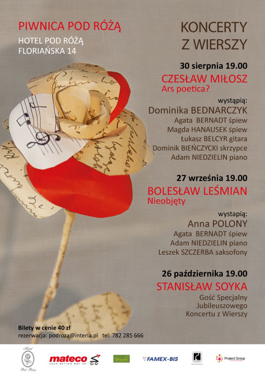 Obu Paniom towarzyszyć będzie Agata Bernadt, œpiewajšca wiersze wspomnianych poetów. Wokalistka znana jest publicznoœci z interpretacji Jana Twardowskiego, Ernesta Brylla czy Janusza Pasierba, a więc poezji nurtu sacrum. Będšc gospodyniš Piwnicy Pod Różš, wspólnie z czołowymi krakowskimi muzykami sięga do najlepszych tradycji piosenki poetyckiej i literackiej. Artyœci majš ambicję reaktywować Piwnicę Hotelu Pod Różš, by w Krakowie cyklicznie działała scena promujšca piękno słowa w połšczeniu z ciekawš propozycjš muzycznš. "Koncerty z Wierszy"oraz "Między Wierszami" zainaugurowano w paŸdzierniku 2014r. Dlatego 1 rok działalnoœci reaktywowanej Piwnicy Pod Różš zamyka Stanisław Soyka, który zagra i zaœpiewa dla nas swoje najpiękniejsze kompozycje.