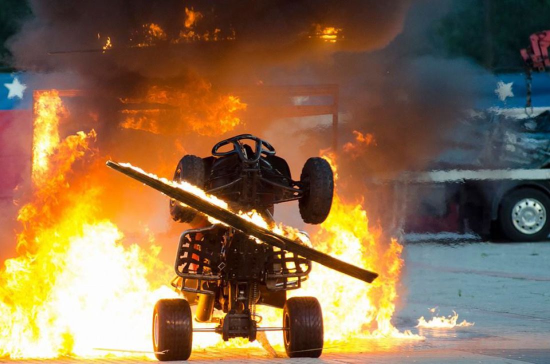 * przejazd przez cianę ognia z człowiekiem na masce pojazdu;