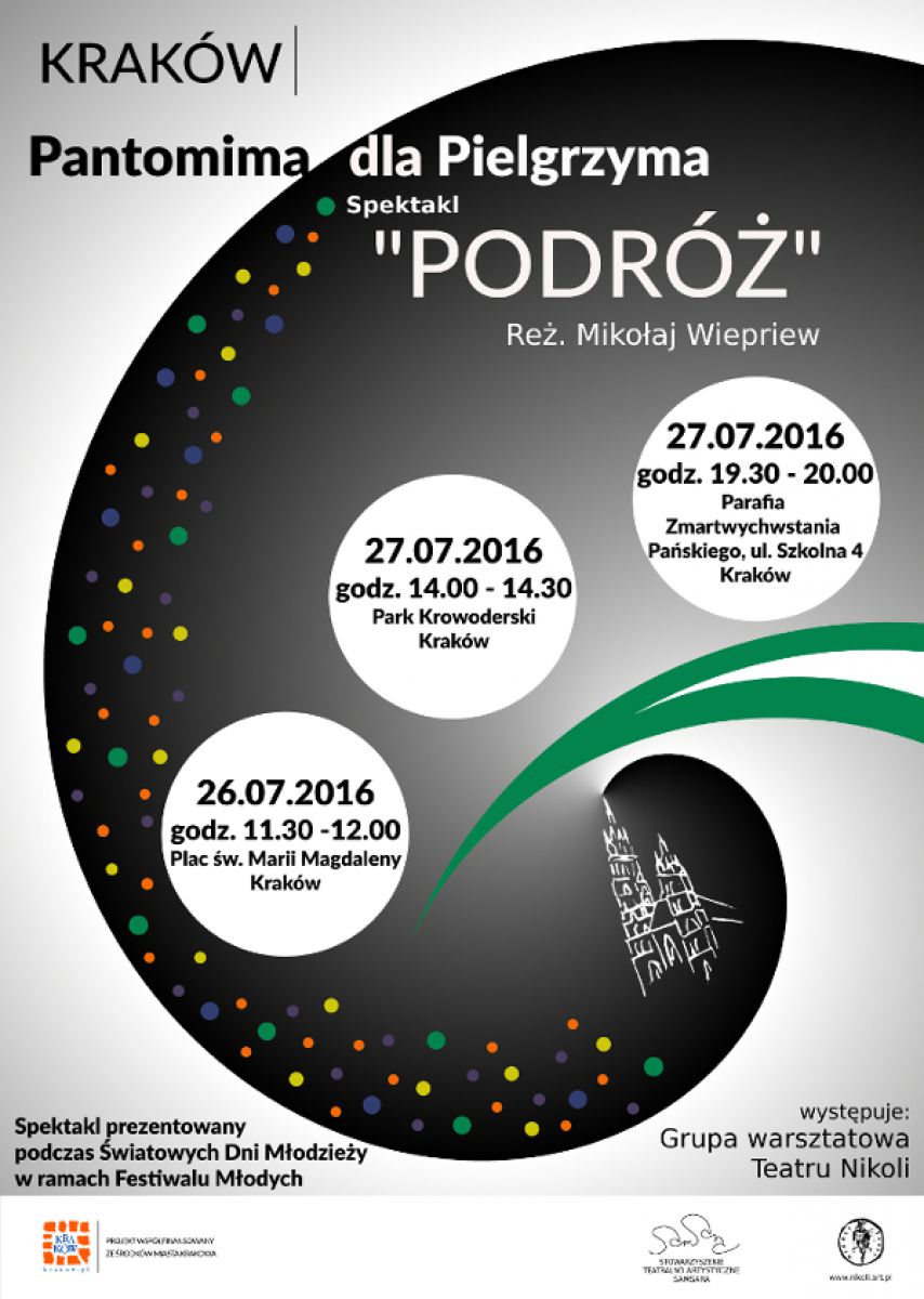 Wybrana podczas bezpłatnych warsztatów teatru ruchu i pantomimy krakowska młodzież pracujšc pod okiem Mikołaja Wiepriewa /reżysera i aktora Teatru Nikoli/ stworzyła sztukę, która zaprezentowana zostanie podczas wiatowych Dni Młodzieży w Krakowie.