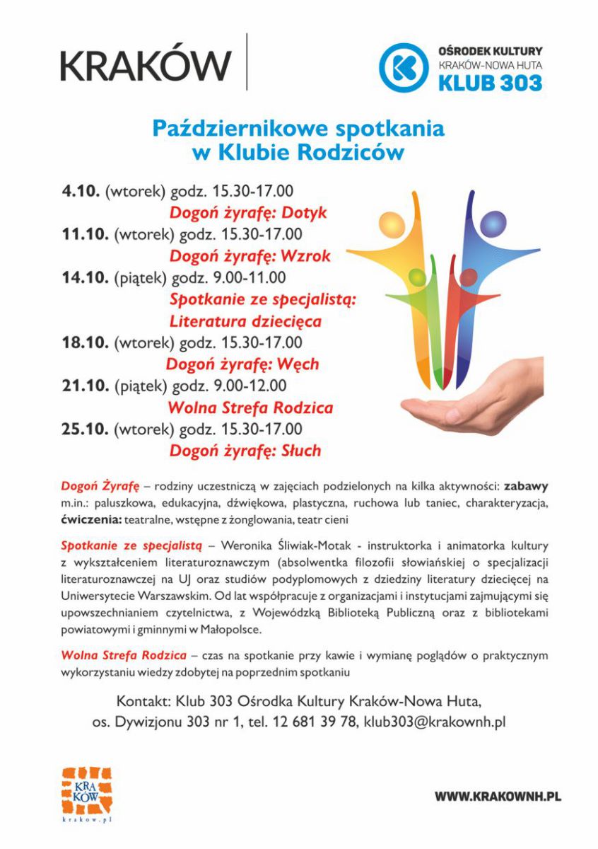 Klub 303 Orodka Kultury Kraków-Nowa Huta (os. Dywizjonu 303 nr 1) serdecznie zaprasza na kolejne spotkanie Klubu Rodziców, którego gociem będzie Weronika liwiak-Motak instruktorka i animatorka kultury z wykształceniem literaturoznawczym. Spotkanie odbędzie się 14 padziernika o godz. 9:00. Prowadzšca jest absolwentkš filologii słowiańskiej o specjalizacji literaturoznawczej na UJ oraz studiów podyplomowych z dziedziny literatury dziecięcej na Uniwersytecie Warszawskim. Od lat współpracuje z organizacjami i instytucjami zajmujšcymi się upowszechnianiem czytelnictwa, z Wojewódzkš Bibliotekš Publicznš oraz z bibliotekami powiatowymi i gminnymi w Małopolsce. Autorka i koordynatorka licznych projektów oraz zajęć literackich i kulturoznawczych dla dzieci. Prowadzi warsztaty dla bibliotekarzy i nauczycieli chcšcych pracować z ksišżkš dla dzieci, jest tłumaczkš literatury dziecięcej i młodzieżowej w Wydawnictwie Olesiejuk (od 2014 roku) oraz autorkš ksišżek Wszechwiat ze szkła (dla dorosłych) i Niepołomicki krakowiaczek (dla dzieci) oraz redaktorkš publikacji dla najmłodszych w ramach realizowanych projektów. Mama dwóch córek Mani (11 lat) i Hani (5 lat), które sš jej największym życiowym osišgnięciem.