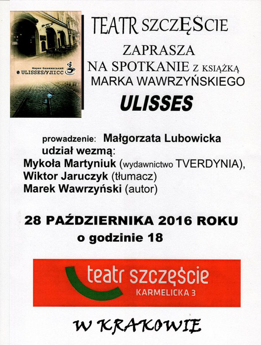 Teatr Szczęcie zaprasza na promocję niezwykłej ksišżki - jest to niewštpliwie wydarzenie artystyczne tego roku - nie można go przegapić - wezmš w nim udział gocie z Ukrainy, którzy specjalnie przyjadš do Krakowa, aby opowiedzieć nam o ksišżce "Ulisses" wydanej w języku polskim i ukraińskim. To bardzo ciekawe osobowoci: MYKOŁA MARTYNIUK - poeta,prozaik,literaturoznawca, dyrektor wydawnictwa Twerdynia;