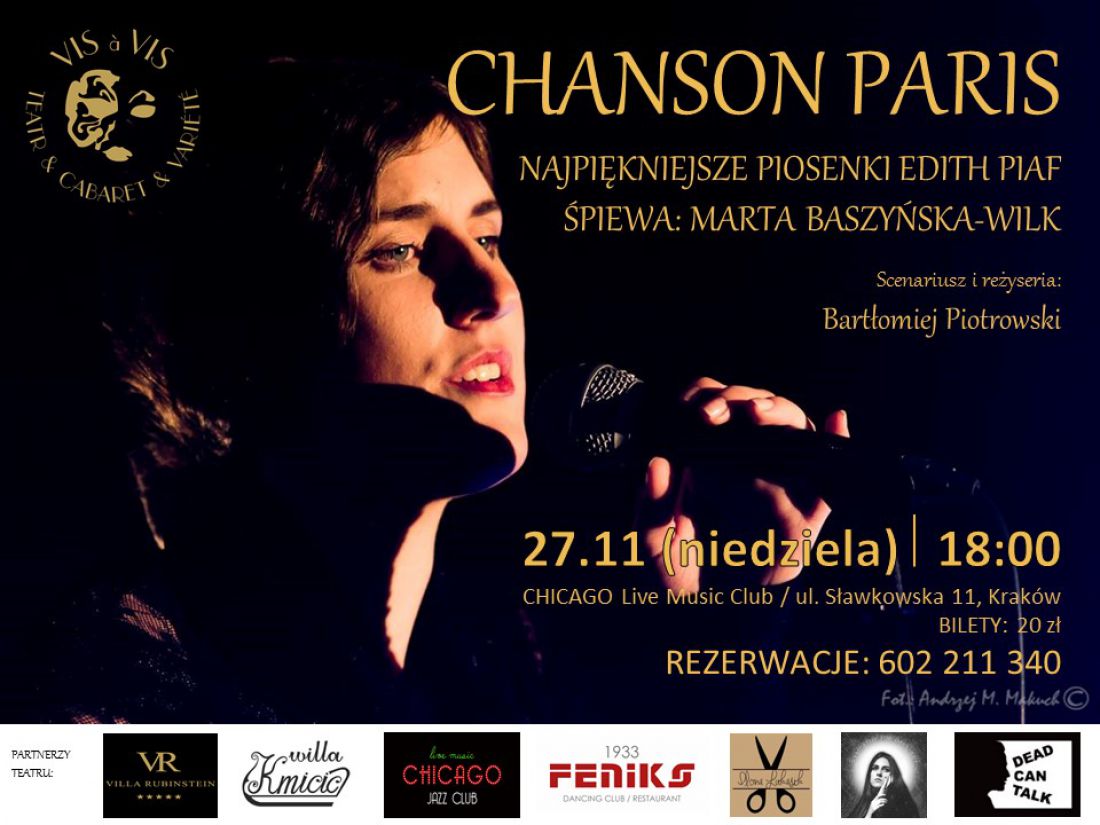 W wyjštkowym programie CHANSON PARIS - najpiękniejsze piosenki Edith Piaf, francuskie szlagiery oraz przeboje Ewy Demarczyk, a także wiersze Jacquesa Preverta i Haliny Powiatowskiej - zapiewa Gwiazda scen muzycznych, artystka Teatru VIS a VIS - Marta Baszyńska - Wilk.