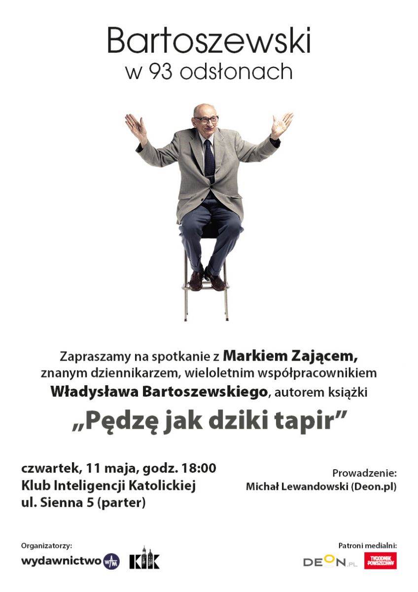 Spotkanie z Markiem Zajšcem wokół ksišżki “Pędzę jak dziki tapir. Bartoszewski w 93 odsłonach” odbędzie się w czwartek, 11 maja, o godz. 18.00 w Klubie Inteligencji Katolickiej, ul. Sienna 5. Poprowadzi je Michał Lewandowski (portal Deon.pl.