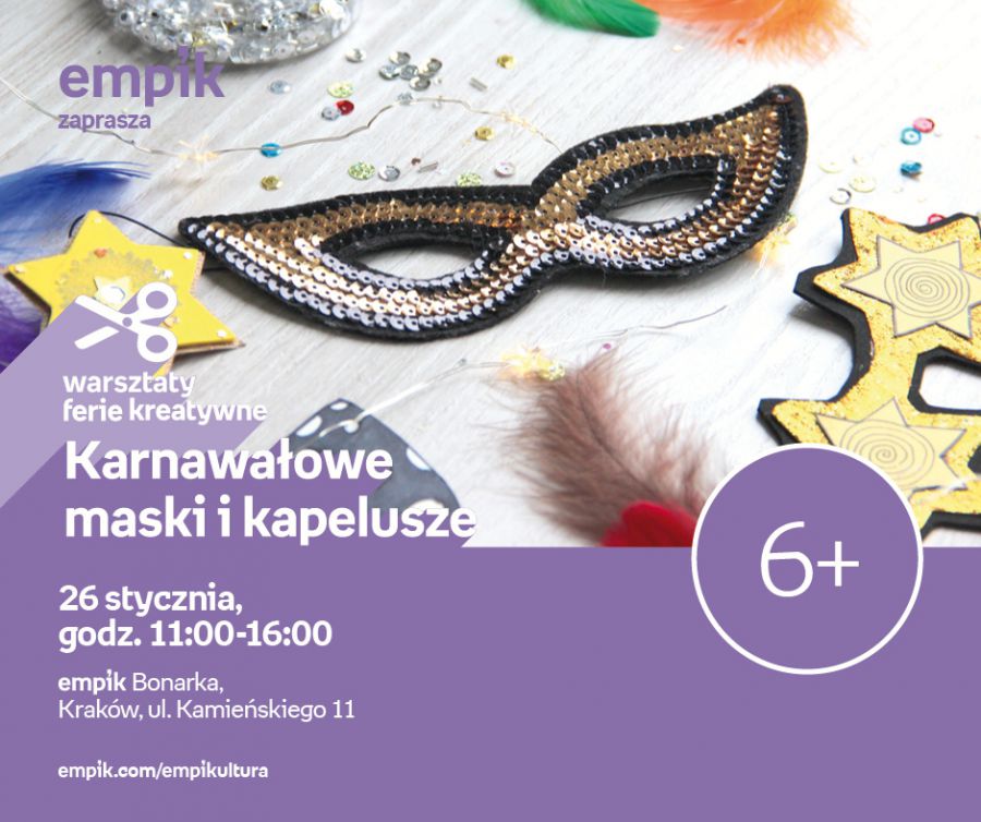 Ferie przypadajš w tym samym czasie co karnawał. A jak karnawał to zabawa, bale przebierańców i wymylne stroje. Salon Empik Bonarka proponuje uczestnikom warsztatów naukę wykonywania niezwykłych masek inspirowanych karnawałem w Wenecji, kapeluszy urozmaicajšcych kreacje, a także quillingowych ozdób, które wzbogacš każdy strój. Zajęcia zostały przygotowane zarówno z mylš o osobach, które chciałyby zrealizować własne pomysły, jak i tych, którzy szukajš inspiracji i podpowiedzi. Każdy znajdzie co dla siebie. Warsztaty w Empiku to idealna okazja do stworzenia niepowtarzalnych pamištek. To też możliwoć rozwinięcia swoich pasji i odkrycia nowych. Zajęcia przeznaczone sš dla dzieci w wieku 6+.