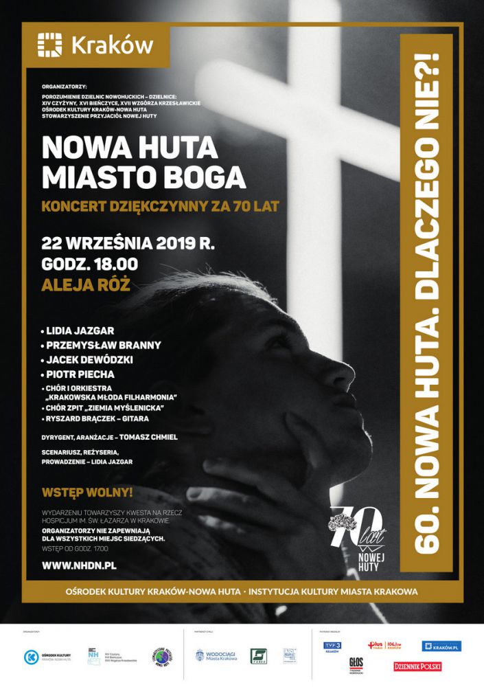 dzi w Nowej Hucie jest kilkanacie kociołów i tysišce wiernych. Tak to się ťinaczejŤ potoczyło. Ale łatwo nie było. 70 lat historii tej dzielnicy Krakowa to także 70 lat walki o Krzyż, walki o Kociół i kocioły, walki o wolnoć. Także wolnoć serca." mówi Lidia Jazgar, dyrektor artystyczna cyklu Nowa Huta. Dlaczego Nie?! i jedna z ponad stu artystów, którzy wystšpiš w koncercie, zatytułowanym NOWA HUTA MIASTO BOGA.