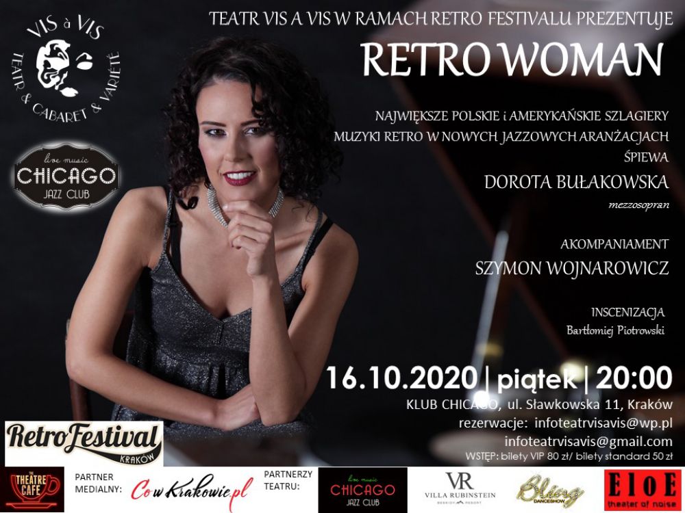 Zapraszamy Państwa zatem na jedyny w swoim rodzaju spektakl pełen czaru, szyku i elegancji będšcy inscenizacjš największych szlagierów w stylu i klimacie RETRO & GLAMOUR, które w programie RETRO WOMAN zapiewa dla Państwa artystka Teatru VIS A VIS, aktorka scen muzycznych - obdarzona niezwykłym głosem DOROTA BUŁAKOWSKA.