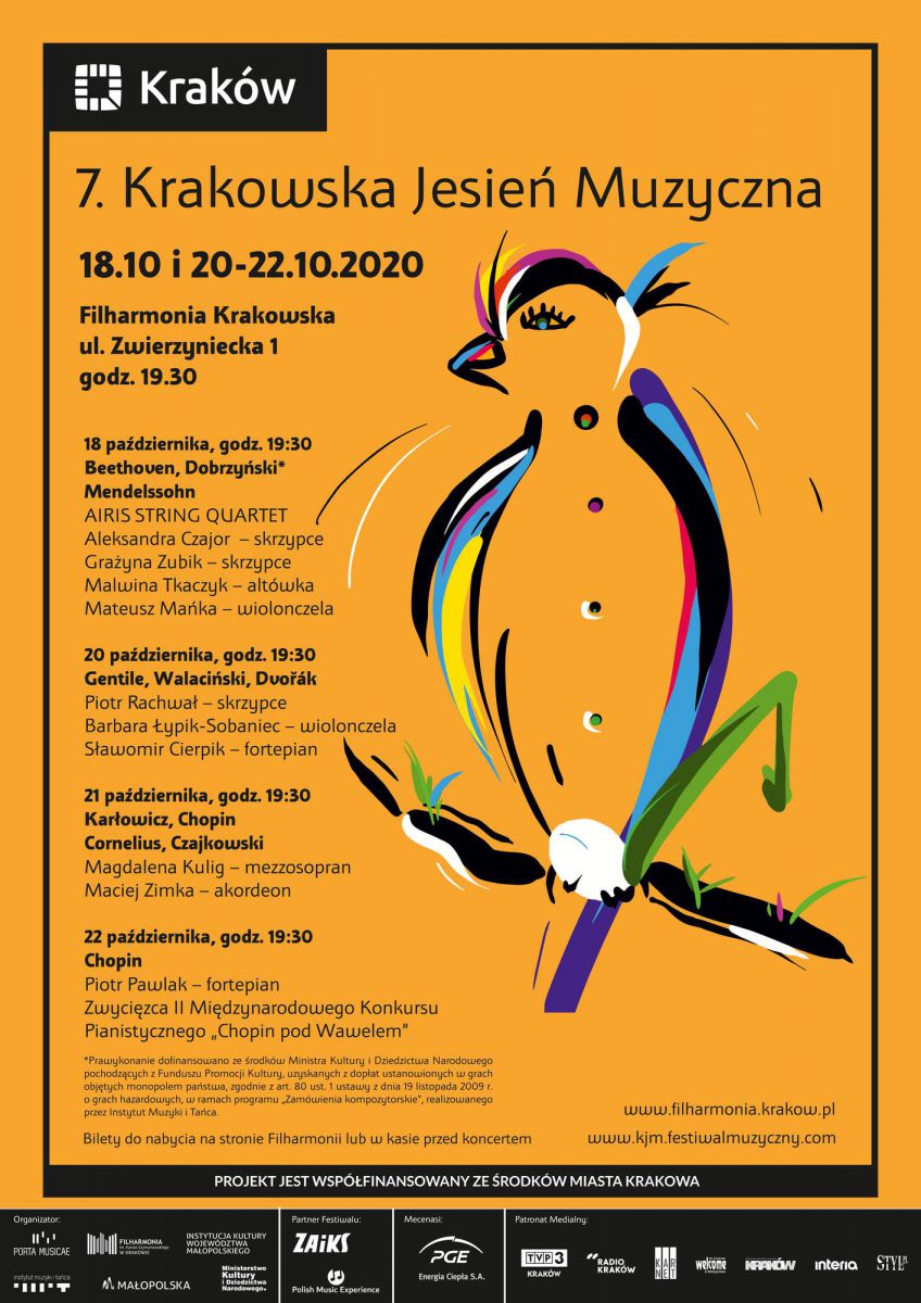 7. Krakowska Jesień Muzyczna to cztery spotkania z kameralnš muzykš klasycznš, w najlepszym wykonaniu. W programach koncertów znalazły się dzieła pochodzšce z klasyki repertuaru oraz utwory kompozytorów współczesnych. Festiwal zainauguruje Airis String Quartet, który zaprezentuje kwartety smyczkowe Ludwiga van Beethovena i Felixa Mendelssohna. Podczas tego koncertu artyœci dokonajš także œwiatowej premiery utworu Michała Dobrzyńskiego, zamówionego i napisanego specjalnie na siódmš edycję Krakowskiej Jesieni Muzycznej w ramach programu "Zamówienia kompozytorskie" Instytutu Muzyki i Tańca. Drugiego dnia festiwalu skrzypek Piotr Rachwał, wiolonczelistka Barbara Łypik-Sobaniec oraz pianista Sławomir Cierpik zaprezentujš program składajšcy się z dzieł Ady Gentile, Adama Walacińskiego i Antonina Dvořáka. Trzeciego dnia, duet jakiego jeszcze na festiwalu nie było - mezzosopranistka Magdalena Kulig i akordeonista Maciej Zimka, wykonajš pieœni Mieczysława Karłowicza, Fryderyka Chopina, Petera Corneliusa oraz Piotra Czajkowskiego. Na zakończenie tegorocznej edycji Krakowskiej Jesieni Muzycznej wyjštkowy młody pianista, zwycięzca II Międzynarodowego Konkursu Pianistycznego "Chopin pod Wawelem" (2019), Piotr Pawlak wykona utwory fortepianowe Fryderyka Chopina.