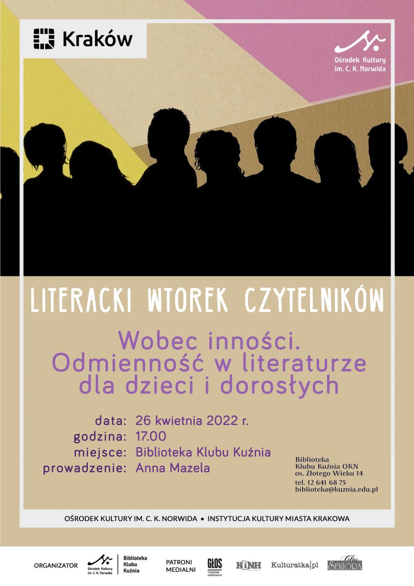 Inny, obcy te pojęcia od dawna inspirujš pisarzy i filozofów, wspomnieć tu można choćby Alberta Camusa czy Emmanuela Lévinasa. Czym jednak właciwie jest innoć? Jak jš rozumie współczesna literatura beletrystyczna dla dzieci, młodzieży i dorosłych? Jakiego typu odmiennoć szczególnie interesuje dzi pisarzy i czytelników? Na spotkaniu dokonamy subiektywnego przeglšdu literatury opisujšcej innoć wynikajšcš zarówno z pochodzenia, statusu ekonomicznego, choroby czy wewnętrznego odczucia oraz porozmawiamy o tym, czym innoć jest dzisiaj dla nas samych.