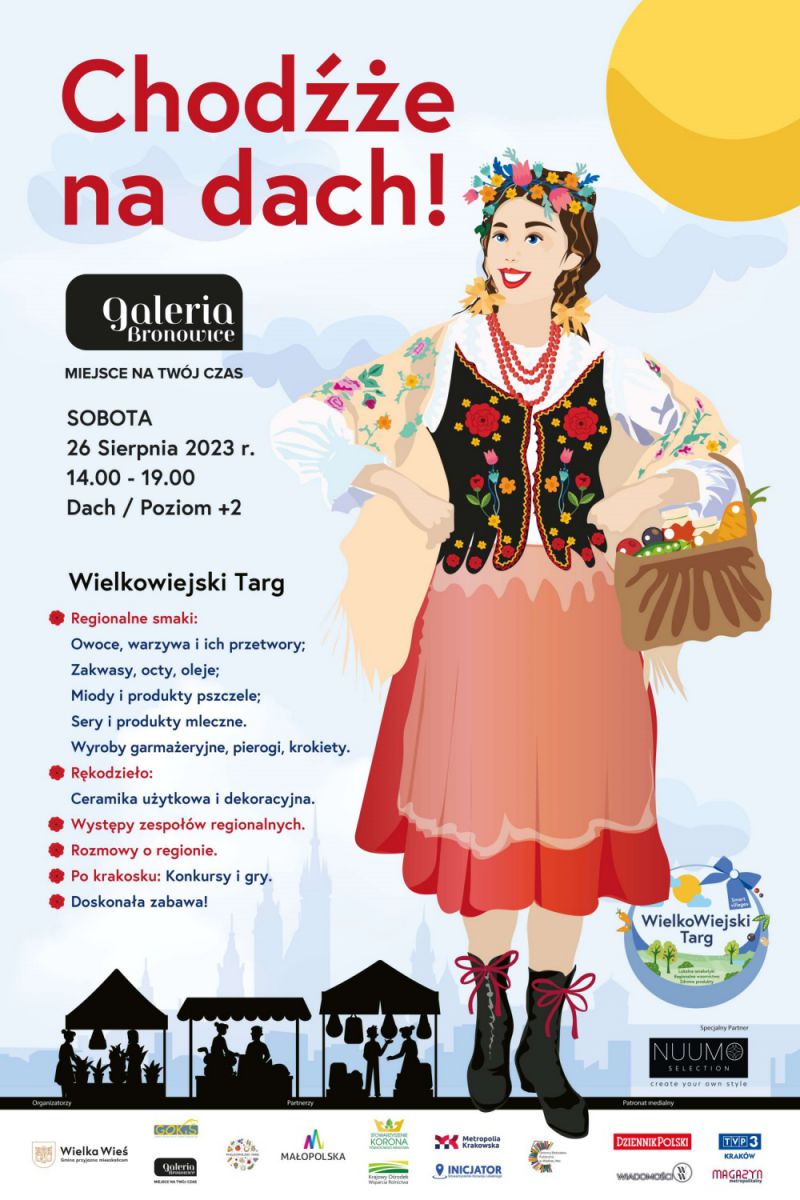 Wielkowiejski Targ, zorganizowany w ostatnią sobotę sierpnia na dachu Galerii Bronowice, będzie doskonałą okazją do skosztowania oraz zakupu wysokogatunkowych lokalnych produktów, takich jak sery kozie, miody, oleje, przetwory i zakwasy, a także dań kuchni polskiej czy podkrakowskich ciast. Wystawione zostaną też wyroby rzemieślnicze w postaci ceramiki użytkowej, świec, ozdób i wielu innych. Imprezę z widokiem na Bronowice uświetnią występy zespołów folklorystycznych oraz Kół Gospodyń Wiejskich z gminy Wielka Wieś. Miejscowi artyści zaprezentują regionalne pieśni ludowe oraz krótkie formy literackie, opowiedziane „godką krakoską”. To jednak nie wszystko! Na uczestników czekać będą zabawy dla całych rodzin oraz konkursy. Główną nagrodę – deesignarski czajnik bezprzewodowy – przekazał sklep NUUMO (Galeria Bronowice, poziom 0). W ramach wydarzenia „Chodźże na dach” zorganizowany zostanie również panel dyskusyjny. W tej części miłośnicy kultury ludowej wysłuchają inspirujących rozmów o historii oraz tożsamości podkrakowskich regionów. Dyskusję poprowadzi Janusz Bończyk, koordynator Wielkowiejskiego Targu.