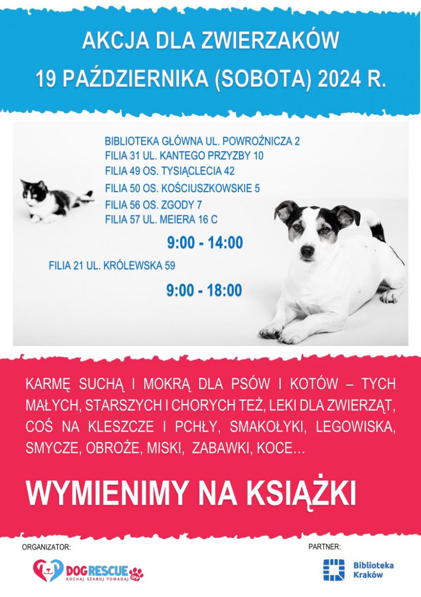 19 października 2024 możesz zrobić coś dobrego dla bezdomnych psów i kotów pod opieką Dog Rescue. W kilku filiach Biblioteki Kraków będzie trwać akcja „Książka za karmę” 🙂