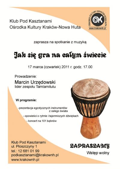 Klub Pod Kasztanami Oœrodka Kultury Kraków – Nowa Huta zaprasza na imprezę Jak się gra na całym œwiecie, która odbędzie się 17 marca 2011 (czwartek) o godz. 17.00 w Klubie.