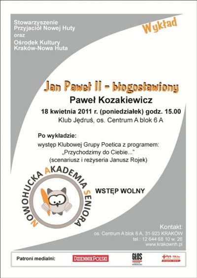 (scenariusz i reżyseria Janusz Rojek). Podczas wykładu omówione zostanš następujšce zagadnienia: pontyfikat Ojca więtego w kontekcie 8 błogosławieństw, historia i znaczenie historyczne przymiotu błogosławiony, próba odpowiedzi na pytanie Jan Paweł II dlaczego błogosławiony? Zapraszajš Stowarzyszenie Przyjaciół Nowej Huty oraz Orodek Kultury Kraków-Nowa Huta.