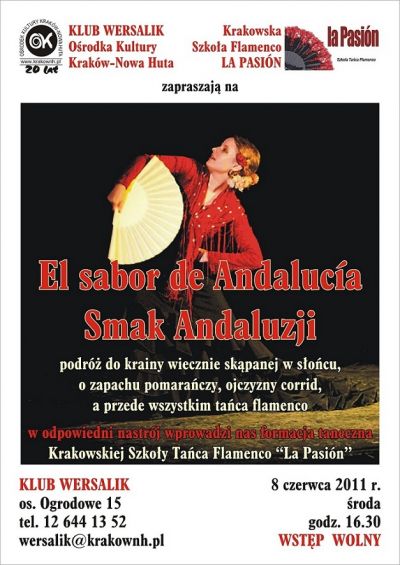 Klub Wersalik Orodka Kultury Kraków - Nowa Huta (os. Ogrodowe 15) i Krakowska Szkoła Flamenco La Pasión zapraszajš 8 czerwca 2011 r. o godz. 16.30 do wspólnej podróży do Andaluzji, krainy wiecznie skšpej w słońcu i zapachu pomarańczy, ojczyzny corrid, a przede wszystkim tańca flamenco.