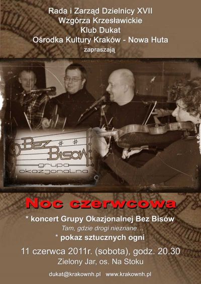 Orodek Kultury Kraków Nowa Huta oraz Rada i Zarzšd Dzielnicy XVII Wzgórza Krzesławickie zapraszajš mieszkańców dzielnicy na coroczne obchody nocy czerwcowej. Impreza odbędzie się w Zielonym Jarze 11 czerwca (sobota) 2011 r. od godz. 20.30.