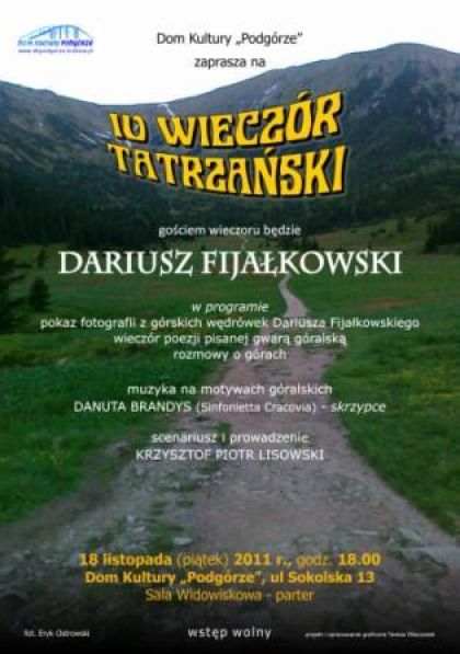 Goœciem wieczoru będzie DARIUSZ FIJAŁKOWSKI w programie pokaz fotografii z górskich wędrówek Dariusza Fijałkowskiego, wieczór poezji pisanej gwarš góralskš, rozmowy o górach.
