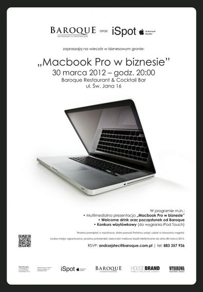 W pištek 30 marca Baroque Restaurant & Cocktail Bar oraz iSpot zapraszajš na wyjštkowš prezentację najnowszych Macbook Pro oraz ich zastosowania w biznesie. Dodatkowš atrakcjš będzie konkurs wizytówkowy, w którym nagrodš głównš będzie iPod Touch.