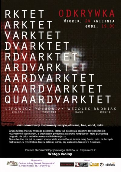 Koncert grupy QUAARDVARKTET, w ramach projektu ODKRYWKA, odbdzie si w Dworku Biaoprdnickim we wtorek 24 kwietnia o godz. 19. Klimatyczn piwnic wypeni jazz nowoczesny z ca mas wpyww i fascynacji muzyk etniczn, free, world, indie.