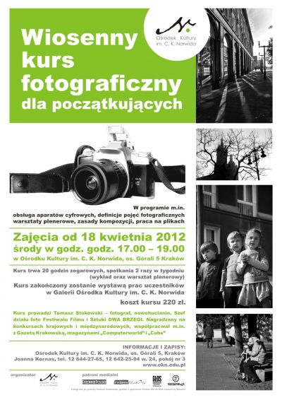 Zapraszamy na kurs fotografii dla poczštkujšcych. Proponujemy różnorodny program zajęć, uczestnicy kursu zapoznajš się m.in. z podstawami obsługi aparatu cyfrowego, zasadami kompozycji oraz podstawami obróbki zdjęć na komputerze. Będš mieli możliwoć przyswojenia wiedzy na temat fotografii architektury i krajobrazu, fotografii portretowej i reportażu. Dla uczestników zaplanowano poza zajęciami teoretycznymi możliwoć wykorzystania tejże wiedzy w plenerze. Po zakończeniu kursu organizatorzy zaplanowali wystawę prac uczestników. Warsztaty poprowadzi fotograf i nowohucianin Tomasz Stokowski, szef działu foto Festiwalu Filmu i Sztuki DWA BRZEGI.