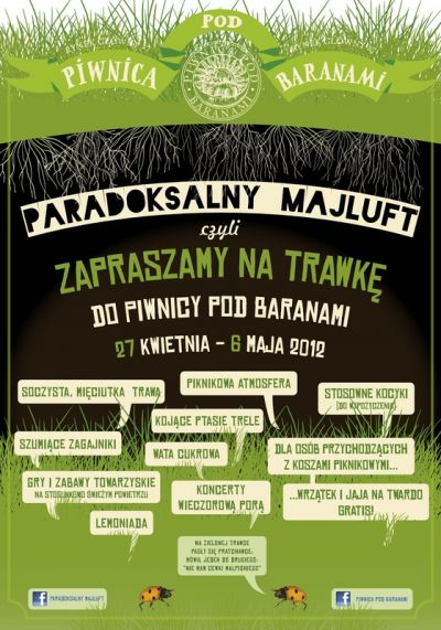 W najdłuższy weekend roku 2012, od 27 kwietnia do 6 maja w Piwnicy pod Baranami, kilka metrów pod ziemiš, będzie można podziwiać niecodzienne zjawisko. Betonowe podłogi zmieniš się w łškę, pokrytš prawdziwš trawš. Stoliki zamieniamy na kolorowe koce. Wszystko to w otoczeniu wieżych kwiatów, drzewek i piewu ptaków. Niemal każdy wieczór umilać będzie recital piwnicznych artystów i nie tylko.
