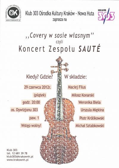 Klub 303 Oœrodka Kultury Kraków-Nowa Huta (os. Dywizjonu 303 1) zaprasza 29 czerwca 2012 r. (pištek) o godz. 20.00 na koncert coverowy.