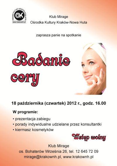 Klub Mirage Orodka Kultury Kraków-Nowa Huta (os. Bohaterów Wrzenia 26) zaprasza panie w wieku dojrzałym na spotkanie z konsultantkami kosmetycznymi.